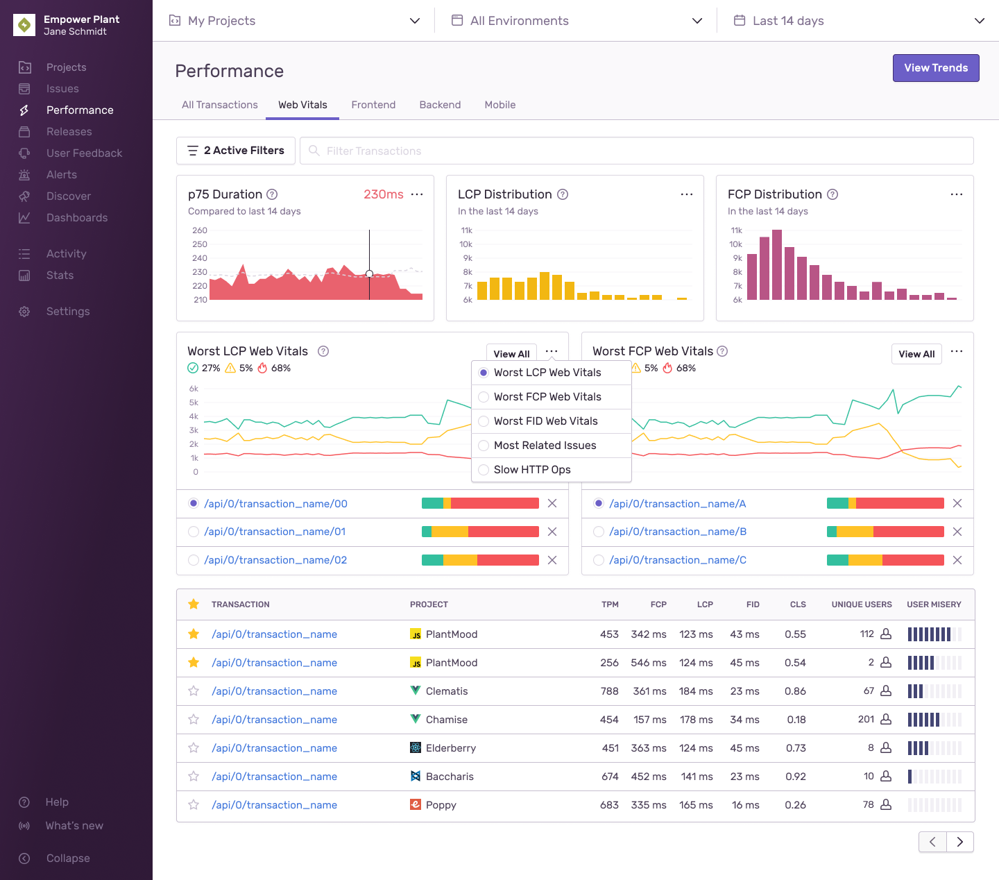Each tab in Performance displays an automatically selected set of widgets and table columns based on the platform of your project. For example, a JavaScript project displays the "Web Vitals" tab by default. Each tab and its metrics are explained below.